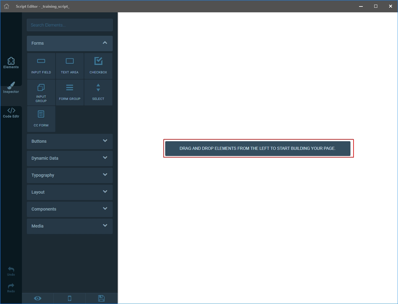 Do note that these Elements are not just basic HTML elements, but rather pre-configured composite items to facilitate quickly building a Script page with typical components; when you drag and drop one of these items, they will be pre-configured with corresponding default components and values.
