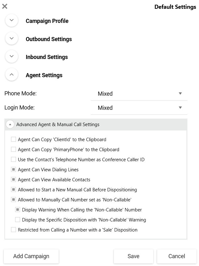 The Campaign Settings configuration area is divided in four major groups, which can be expanded and contracted as needed for better visibility. Obviously, the applicability of settings is directly related to the Campaign type; for example, Inbound Settings are not applicable to Outbound Campaigns.