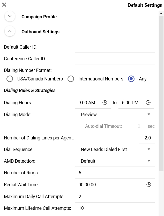 Default Caller ID | The number to be displayed as Caller ID to called parties within this Campaign |