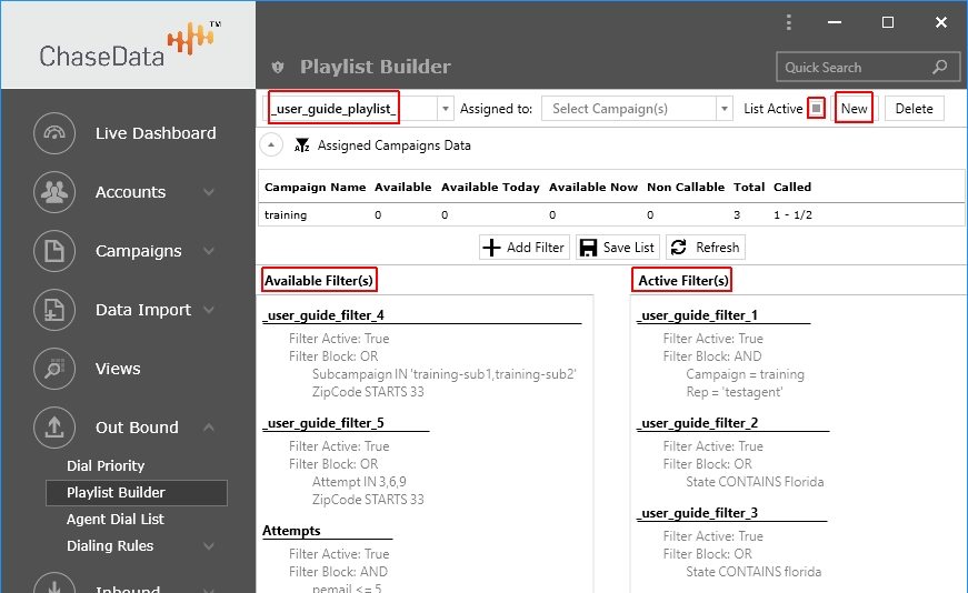We tell the ChaseData CCaaS system how to build a Playlist through a Playlist Builder, by indicating how to select records using Filters applied on the records. For example, create a list from records identified with a specific ‘Campaign’ AND a specific ‘Rep’, AND where the Contact address is in a specific ‘State’. The following picture depicts such a filter set definition.